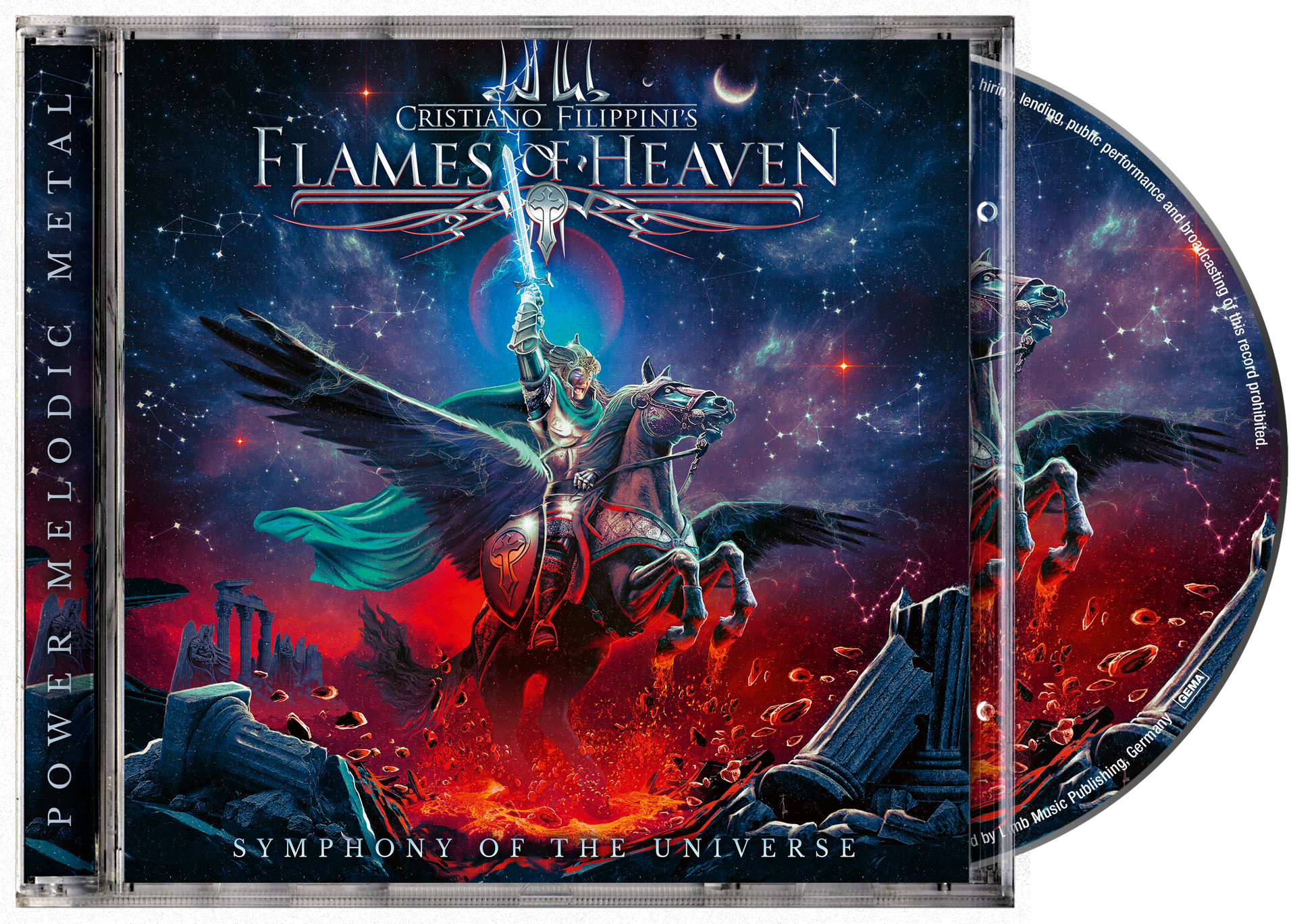 Never change a winning team. Never change a winning formula. Cristiano Filippini’s FLAMES OF HEAVEN strengthens its position among the leading acts of Power Melodic Metal - five years after releasing the critically acclaimed „The Force Within“. Thanks to catchy melodies and brilliant musicianship „Symphony of the Universe“ is the utmost logical follow-up. Spectaculary crafted neoclassical anthems breathing the spirits of an ideally open production with natural sounds. The manga “Saint Seiya” by Masami Kurumada delivered the lyrical inspiration. Shimmering highlights among the twelve songs are „Darkside of Gemini“, „On the Wings of Phoenix“, Midnight Riders“, and „The Power of Stars“.